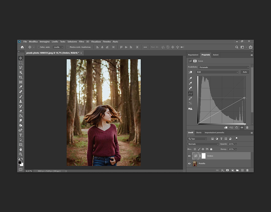 Per iniziare, apri la foto su cui desideri lavorare, vai su Regolazioni, quindi su Curve. Rinominalo Ombre nel pannello Livelli.