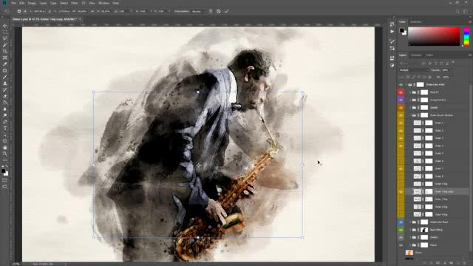 Il set di azioni Watercolor Artist per Adobe Photoshop unisce questi due opposti permettendoti di ottenere un risultato straordinariamente armonioso. Disegnato in esclusiva per Adobe Create da Nuwan Panditha (noto comeBlackNull ), questo set di azioni gratuite è semplice da installare e avviare per creare file facili da personalizzare.