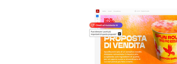 Abbonati subito e risparmia il 25% su Acrobat Pro per i primi 6 mesi. Il prezzo totale per Acrobat Pro e l'Assistente IA è di 24,43 €/mese IVA inclusa per i primi 6 mesi e in seguito di 30,53 €/mese IVA inclusa, mentre il prezzo del solo Assistente IA è di 6,14 €/mese IVA inclusa. Piano annuale con fatturazione mensile. Solo per chi si abbona per la prima volta. Vedi condizioni.