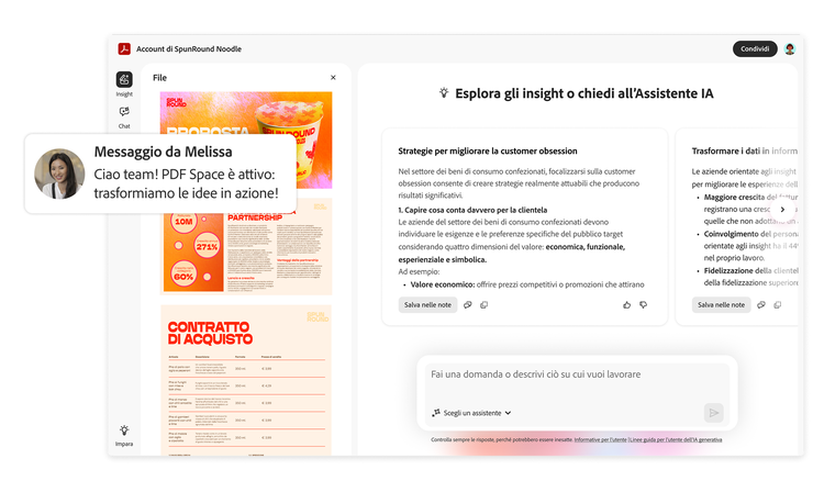 Lavora in modo più intelligente con Acrobat Studio: strumenti PDF affidabili e spazi di lavoro potenziati dall'IA che offrono insight più rapidi e contenuti di qualità superiore. Con PDF Spaces insieme a un Assistente IA personalizzato puoi trasformare i file statici in hub di conoscenza conversazionali, mentre con Adobe Express Premium puoi creare all'istante volantini, poster e post social in linea con il tuo brand.