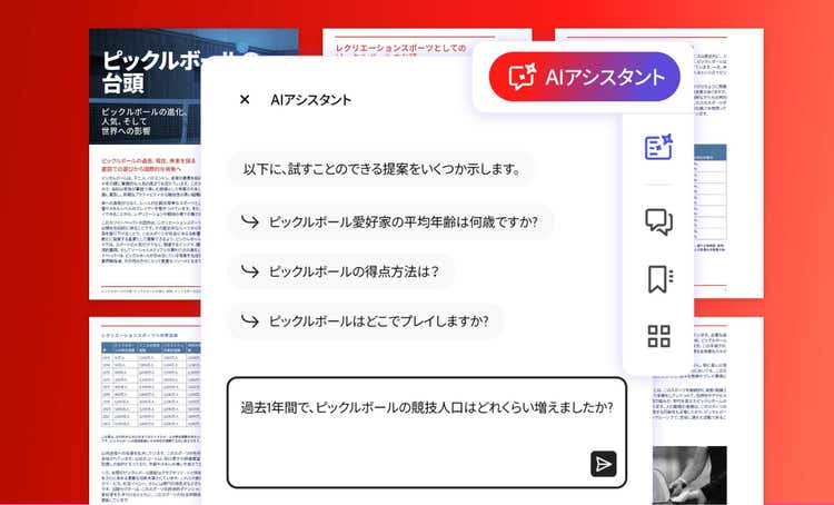 AcrobatにAIアシスタントが新登場。文書に関する質問や、ワンクリックでの要約が表示でき、文書業務の効率が高まります。AcrobatにAIアシスタントを追加しましょう。年間プラン(月々払い)の場合、価格 - ABM - AIアシスタント({{small-tax-incl-label}})でご利用いただけます。