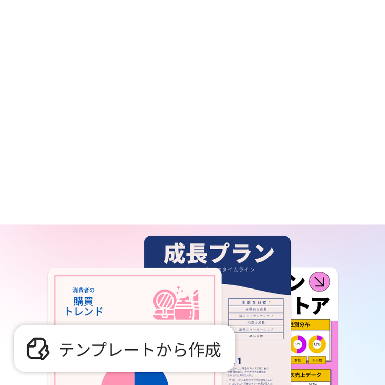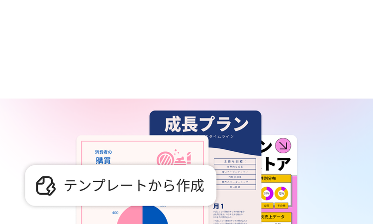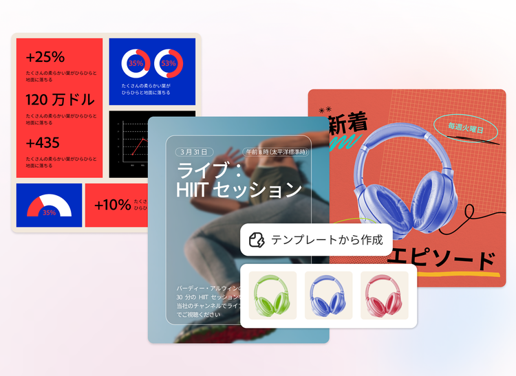 プロがデザインしたテンプレートを使って、チラシ、インフォグラフィック、SNS投稿用のコンテンツをすばやく作成。シンプルなツールとカスタムAI画像で、コンテンツをブラッシュアップできます。