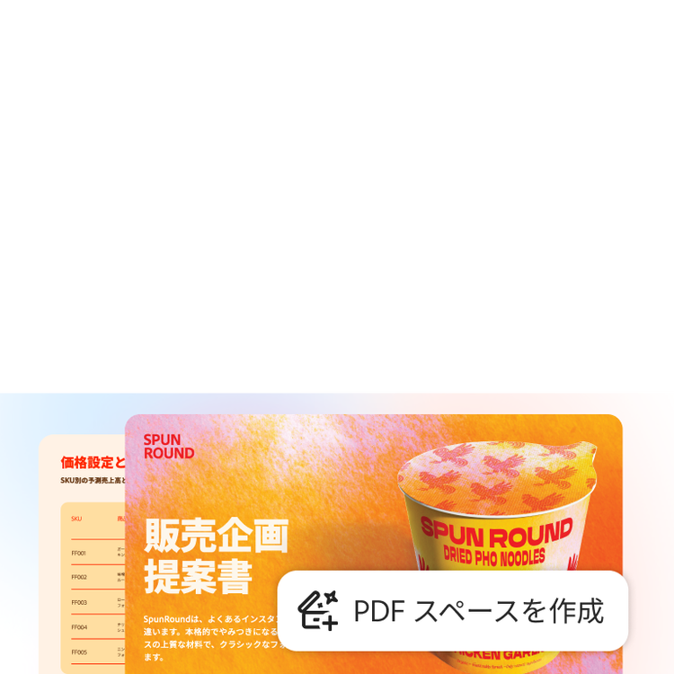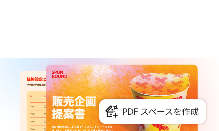 迅速なインサイト、Adobe Expressによる目を引くコンテンツ制作、信頼できるPDFツール。これらがすべて1か所に。PDFスペースで静的なファイルを対話型ナレッジハブに変換し、パーソナライズされたAIアシスタントを使ってより深いインサイトを得ることもできます。