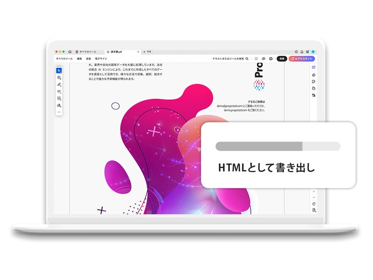 形式を問わずどのファイルでも、その場で編集可能なPDFに書き出し可能です。必要なPDFツールをひとつのソリューションにまとめることで、いつでもどこにいても効率よく作業できます。デスクトップ、モバイル、webのどこからでも、PDFの作成、編集、共有、電子サインがおこなえます。ファイルサイズの縮小も簡単です。