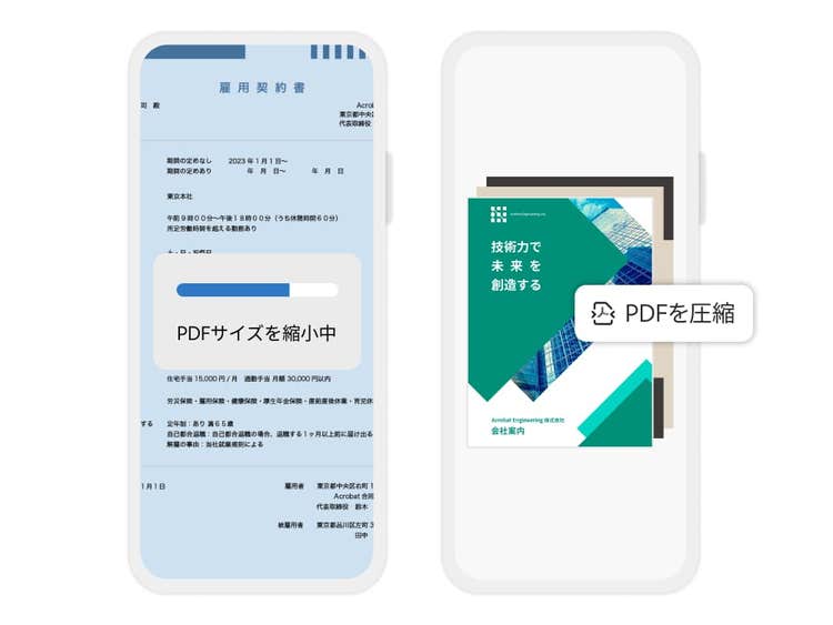 ファイルのサイズが大きすぎて送信できない場合は、圧縮してみましょう。PDFのファイルサイズを縮小すると共有しやすくなるので、共同作業がはかどります。