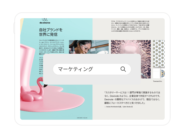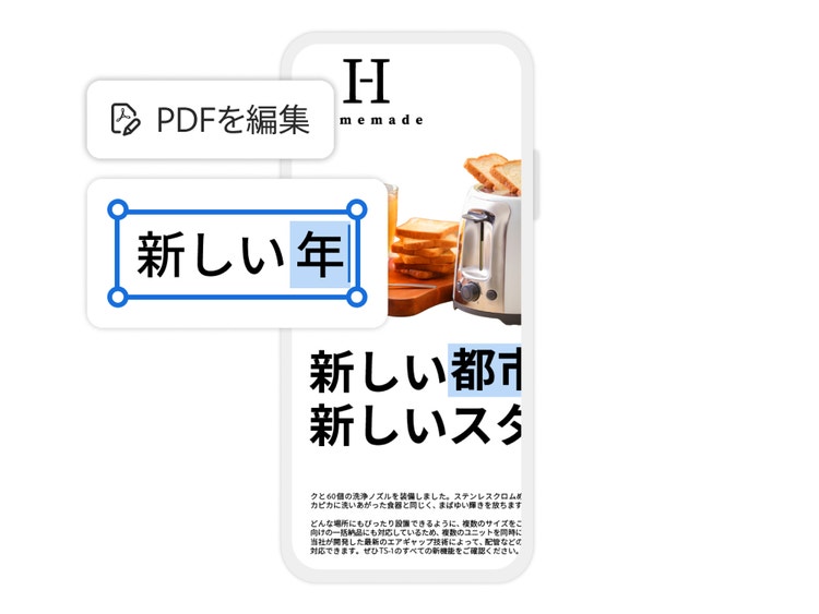 スマートフォン・タブレット・デスクトップ向けのツールが揃ったAdobe Acrobatを使って、自宅でも外出先でも効率良く働きましょう。画像の反転・トリミング・サイズ変更・置き換えをはじめ、テキストの追加・誤字の修正など、さまざまな処理を行うことで、簡単に思い通りのPDFファイルを仕上げることができます。