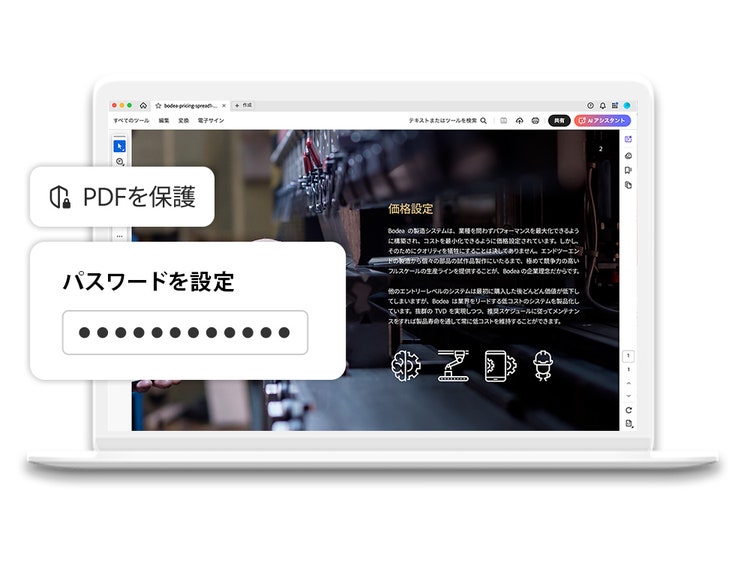 不正アクセスや機密情報の漏洩を防ぐために、PDFをパスワードで保護することができます。またセキュリティ設定をカスタマイズして、PDFの編集、印刷、コピーを制限することも可能。このようにAdobe Acrobatでは、高度なセキュリティ機能によって情報の安全性を確保できます。
