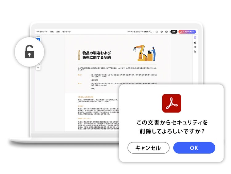PDFをパスワードで保護する必要がなくなったときは、追加したときと同様、とても簡単にパスワードを解除できます。文書の所有者か、適切なアクセス権限を持っていれば、PDFをパスワードで開いてからセキュリティオプションを変更できます。このとき、文書の内容は変更されることなくそのまま維持されます。