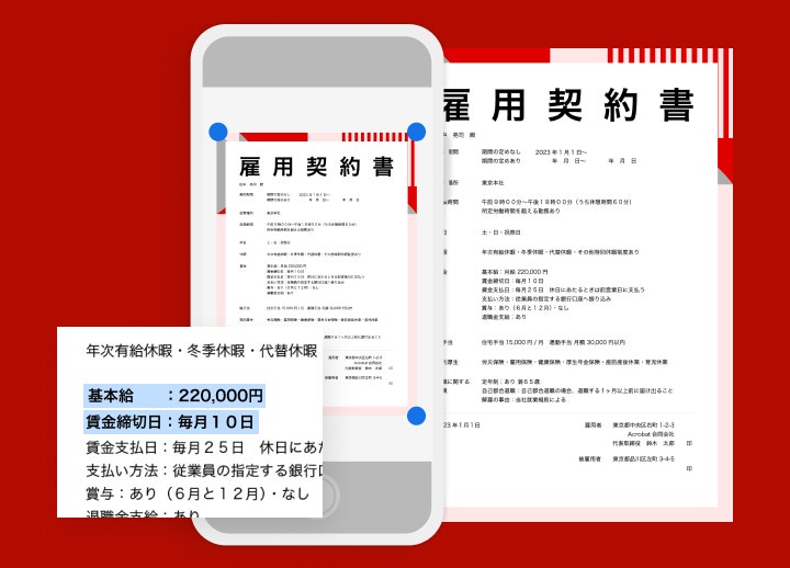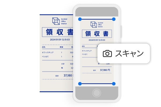 Adobe Scanなら、スマホで紙書類を撮るだけ。書類は即座にPDF化され、テキストコピーや検索、他デバイスでの閲覧が可能なデジタルデータとして扱えます。