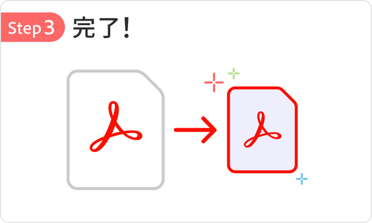 PDFをドラッグ&ドロップするだけで、ファイルサイズを簡単に圧縮できます。軽量化されたPDFは、ダウンロードしたり、ログインして共有したりできます。