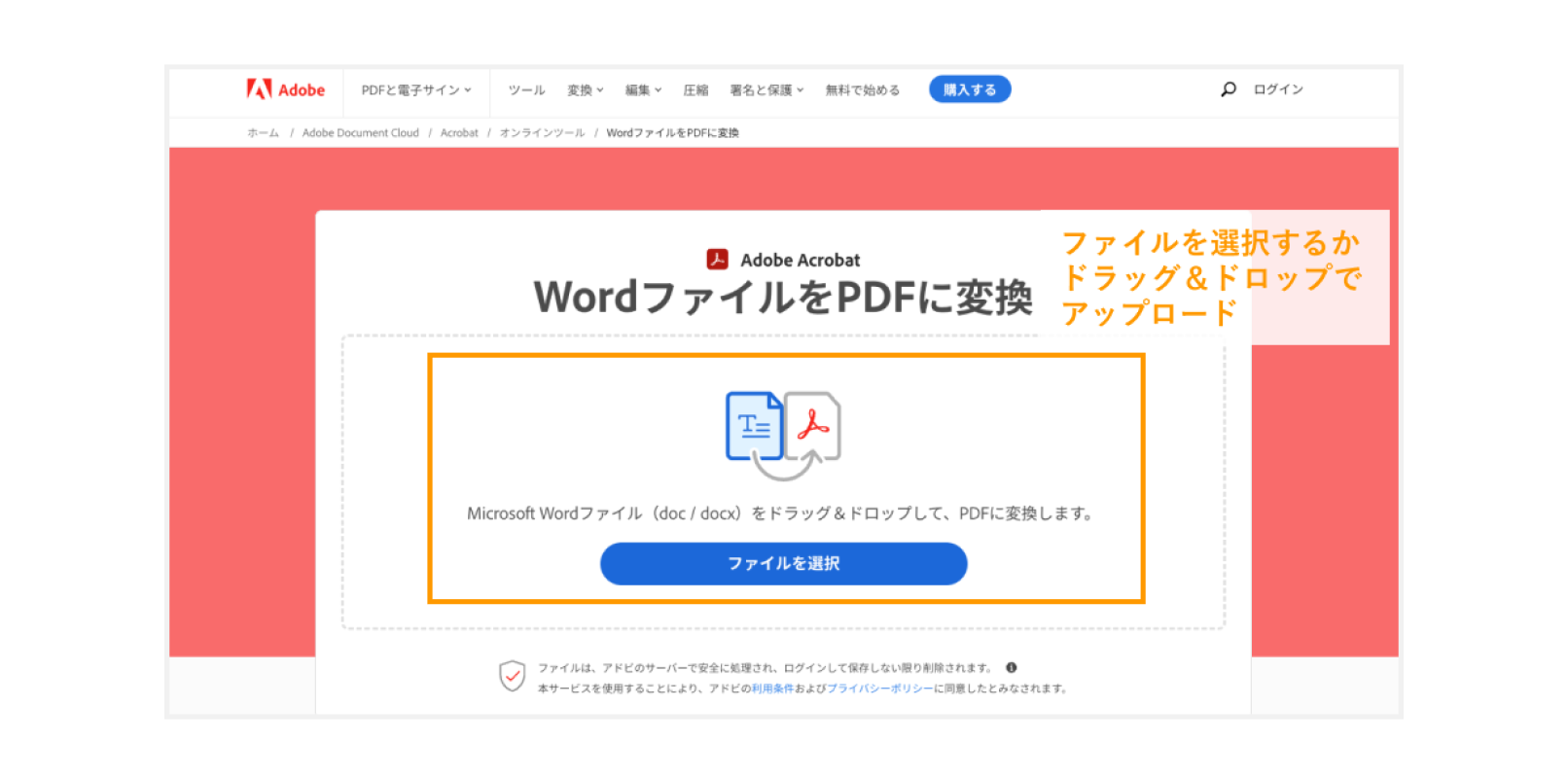 まずは「WordファイルをPDFに変換」のページにアクセスします。