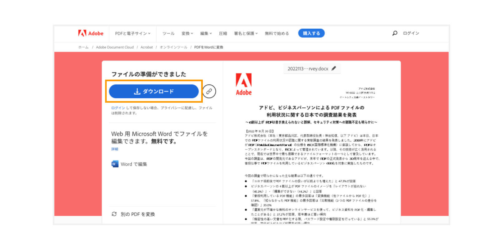 Acrobat オンラインツールを使えば、PDFをWordに変換して、Wordファイルを作成できます。