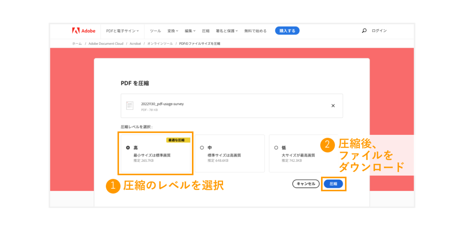 【手順3】圧縮レベルを選んで「圧縮」をクリックする