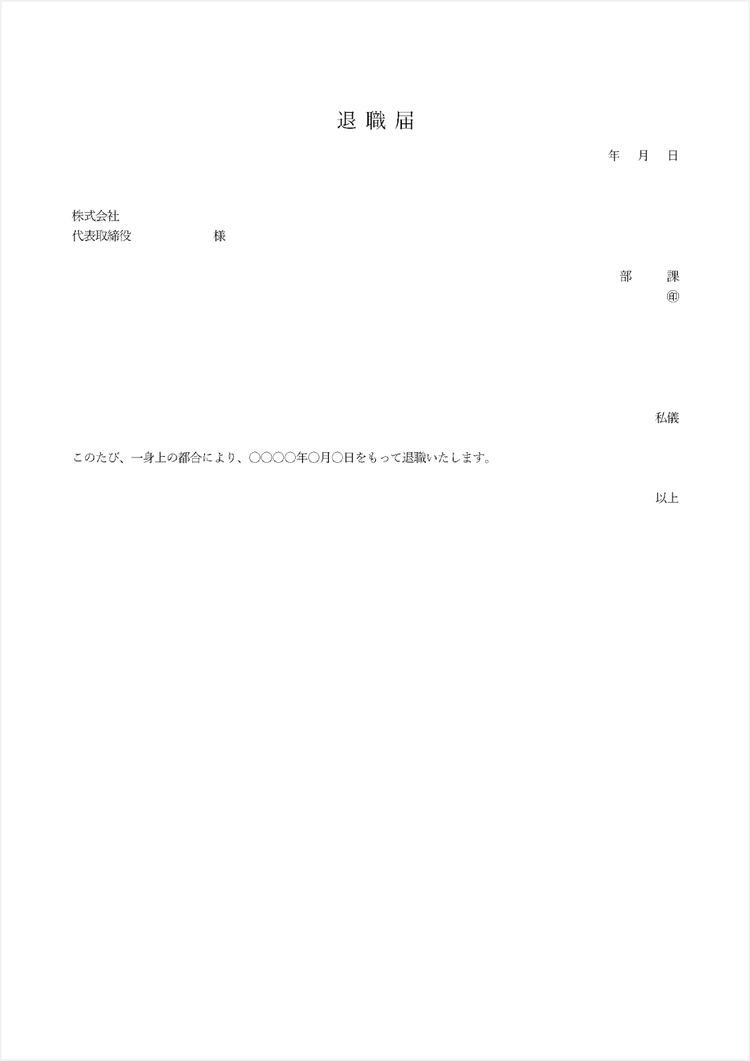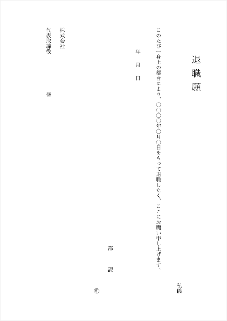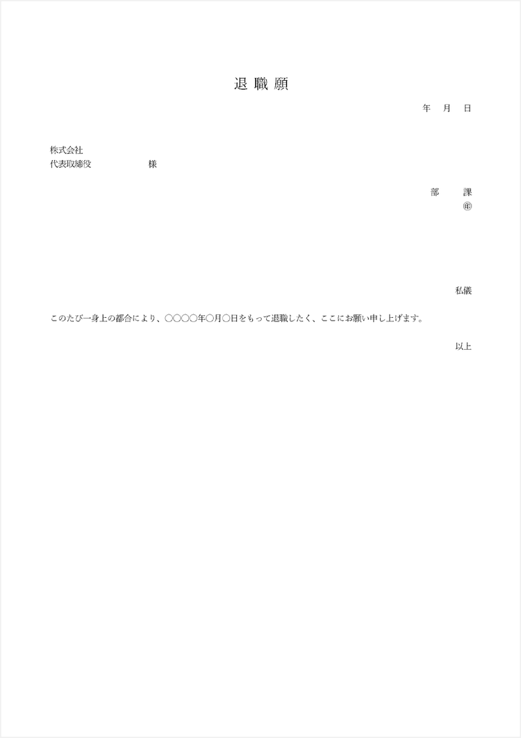 このたび一身上の都合により、〇〇〇〇年〇月〇日をもって退職したく、ここにお願い申し上げます。