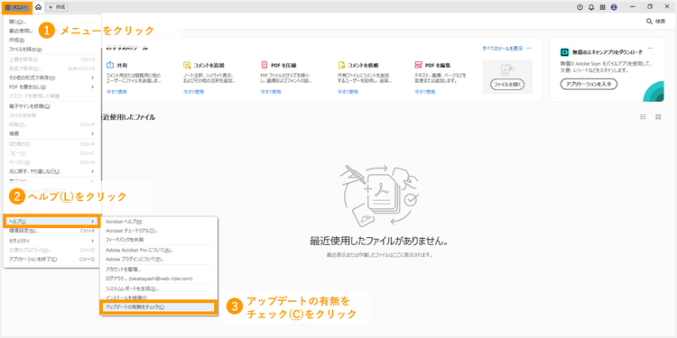 まずは、Adobe Acrobat または Acrobat Readerを起動してください。ソフト起動後、左上のメニューをクリックし、「ヘルプ」の項目から「アップデートの有無をチェック」を選択します。