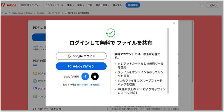 Acrobat オンラインツールへのログインを求められたら、Adobeアカウント、Google アカウント、Facebook アカウント、Apple IDのいずれかでログインしてください。