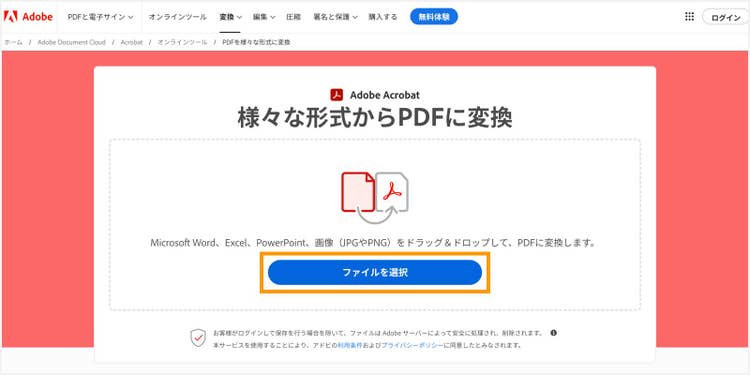 ご紹介するのは、様々なファイル形式を無料でPDFに変換できる「Adobe Acrobat オンラインツール」です。ドラッグ&ドロップの直感的な操作で、カンタンに使えます。また、アップロードしたファイルは自動で暗号化されるため、重要な情報が含まれるファイルも安心して変換できます。