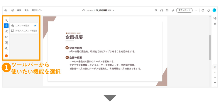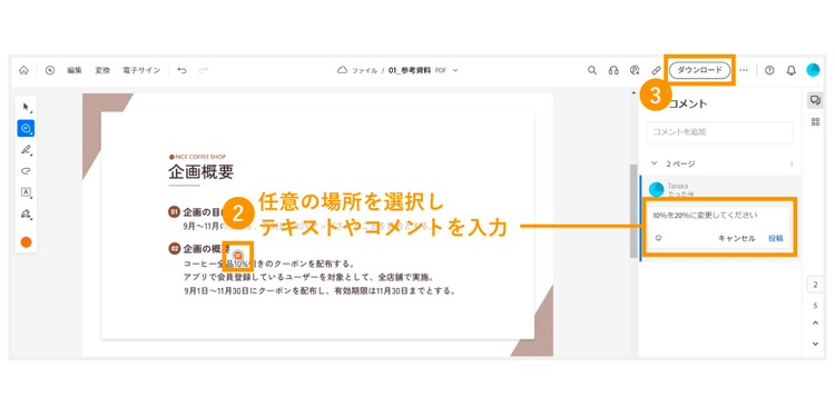 Acrobat オンラインツールなら、PDFへのコメント追加、ページの並び替えや削除、PDFの圧縮といった編集作業を、直感的な操作で行えます。