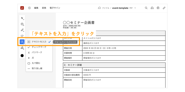 無料のAcrobat オンラインツールでPDFに文字を入力する