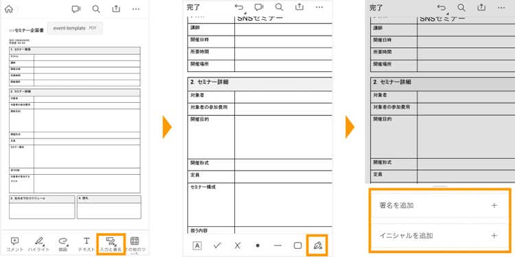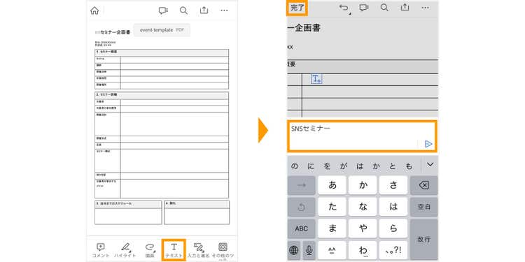 無料アプリ「Adobe Acrobat Reader」をダウンロードすれば、PC同様、テキストや署名の記入ができるので、すぐに作業したい場合でもその場で対応できます。