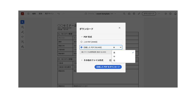 容量の大きなPDFファイルは、ダウンロード時に「圧縮したPDF」を選ぶと、ファイルを軽量化できます。