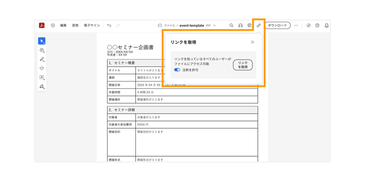 【手順3】PDFファイルをダウンロードまたはリンクで共有する