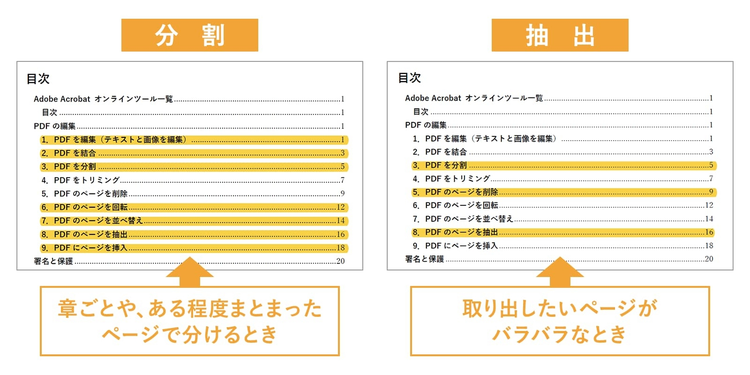 Adobe Acrobat オンラインツールの「分割」機能と「抽出」機能は、それぞれ以下のような場面で使うのがオススメです。