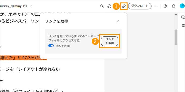 第三者にPDFファイルを共有する場合は、リンクでの共有がオススメです。「ダウンロード」の左にあるリンクのアイコンを選択し「リンクを取得」をクリックすると、共有用のリンクをコピーできます。