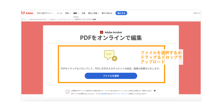 「PDFの編集」のページにアクセスします。画面中央の「ファイルを選択」をクリックし、PCに保存されているファイルを選択、またはボタン付近のエリアにファイルをドラッグ&ドロップしてください。