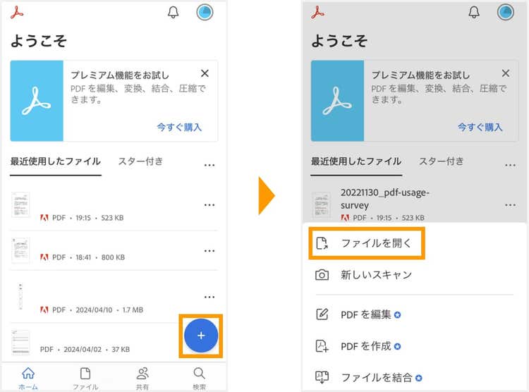 インストールしたら、画面右下の「+」アイコンをタップし「ファイルを開く」を選択します。ファイルの保存先が複数表示されるので、編集したいPDFファイルを選択しましょう。