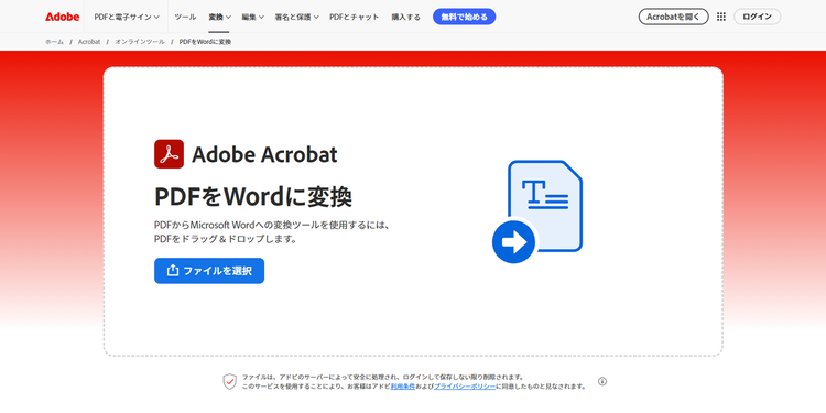 ログインせずにAcrobat オンラインツールを利用した場合、アップロードしたデータはサーバーから削除されるので、安全です。ログインした場合は、アップロードや変換をしたファイルは暗号化してアドビのクラウドストレージに自動で保存され、いつでも削除できます。