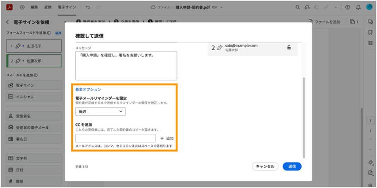 - CC:「全員のサインが完了した後にPDFのコピーを受け取る人」を追加