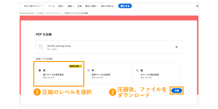 【手順3】希望の圧縮レベルを選択して、「圧縮」をクリックする