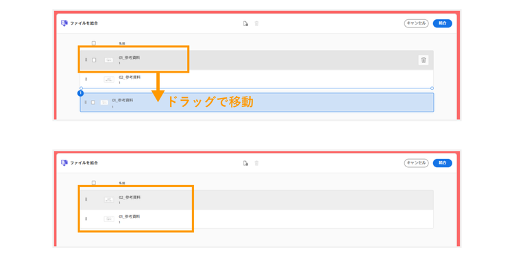 ファイルの結合順を替えたい場合は、ファイルをドラッグし、移動させたい位置まで動かすと、順番を入れ替えられます。