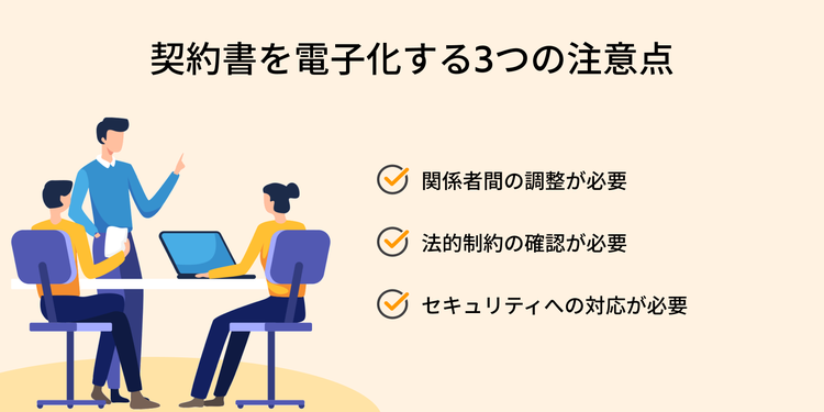 ここでは、「関係者間の調整」「法的制約の確認」「セキュリティへの対応」という3つの観点から、電子化する際の注意点を解説します。