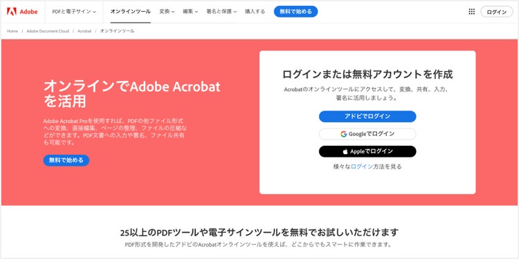 Acrobat オンラインツールでは、無料で25種類以上のPDF編集が可能です。