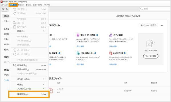 【手順2】Adobe Acrobat Readerを起動し「環境設定」を開く