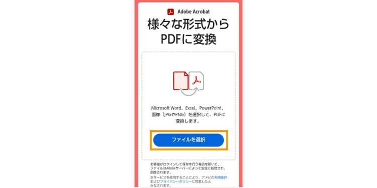 「様々な形式からPDFに変換」にアクセスして、「ファイルを選択」をタップしましょう。