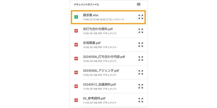 「ファイルを選択」をタップすると、スマホに保存しているファイルが一覧で表示されます。表示された中から変換したいExcelファイルを選択しましょう。すると、ExcelファイルがPDFファイルに変換されます。