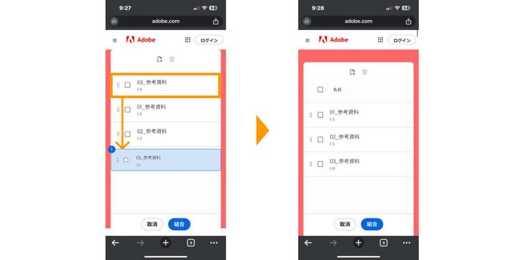 PDFファイルの結合順を替えたい場合は、ファイル名の書かれたエリアを長押ししてドラッグすると、順番を入れ替えられます。