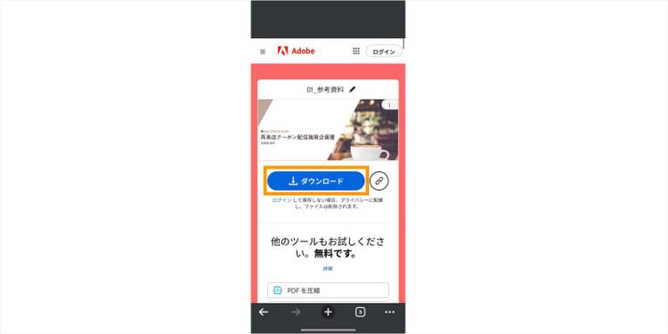圧縮が完了すると、画面が切り替わります。「ダウンロード」をタップして、PDFファイルをダウンロードし、メールに添付して送りましょう。