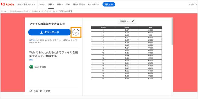 変換したExcelをダウンロードするのではなく、共有用のリンクを発行してほかの人に送ることもできます。