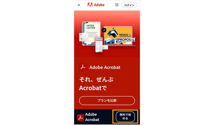 Acrobat Proのページにアクセスして、「無料で始める」ボタンをクリックします。手順に沿って、メールアドレスや必要な情報を入力しましょう。Adobe IDを既にお持ちの場合は、ログインしてください。