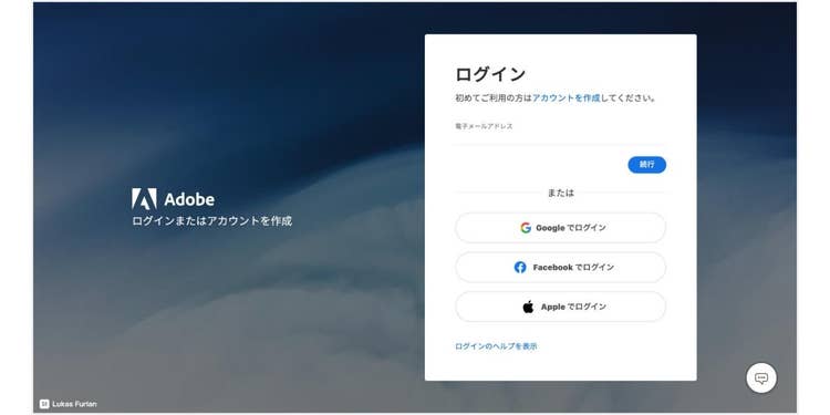 ログイン画面に遷移するので、Adobeアカウント、Google アカウント、Facebook アカウント、Apple IDのいずれかでログインしてください。アカウント作成は無料です。