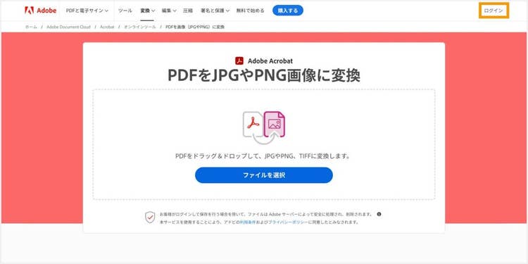 まずは「PDFをJPGやPNG画像に変換」の画面右上にある「ログイン」をクリックしてください。