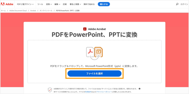 はじめに、Acrobat オンラインツールの「PDFをPPTに変換」ページにアクセスします。