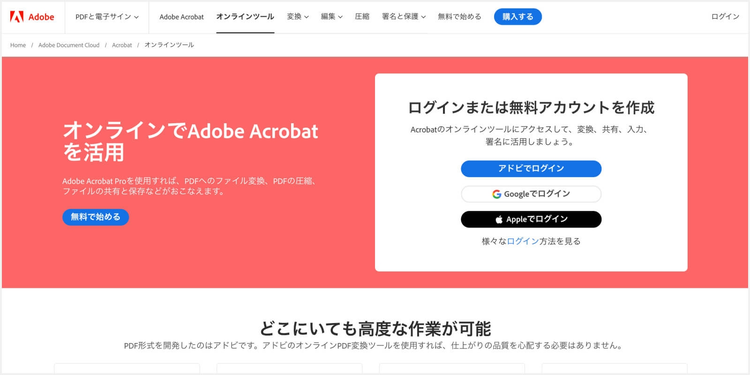 「Adobe Acrobat オンラインツール」は、PDFを開発したアドビが提供する、無料でPDFの変換や編集ができるオンラインツールです。