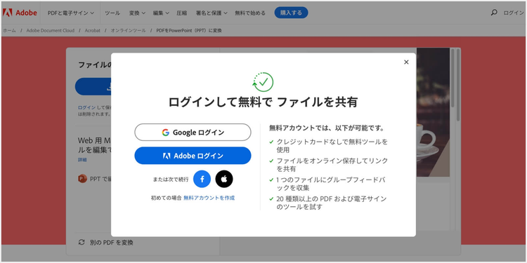 Acrobat オンラインツールへのログインを求められたら、Adobeアカウント、Google アカウント、Facebook アカウント、Apple IDのいずれかでログイン(無料)してください。