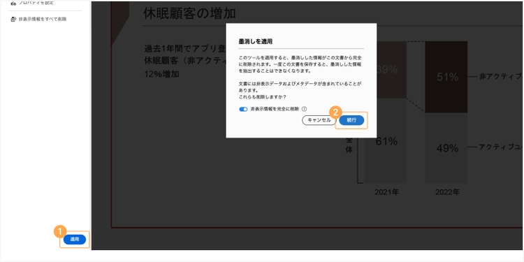 「続行」をクリックすると墨消しが適用され、PDFファイル内から該当のデータが完全に削除されます。
