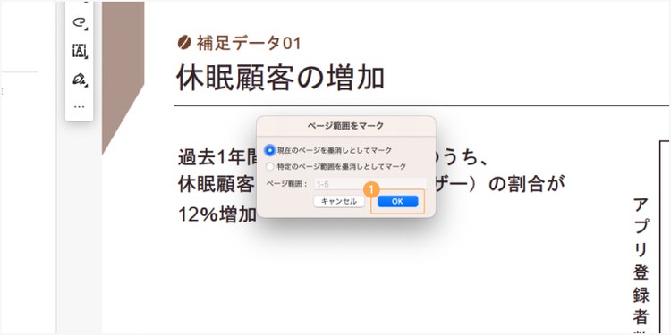 「ページ範囲をマーク」のポップアップウィンドウが表示されたら、「現在のページ」または「特定のページ範囲」のどちらかを選択し、「OK」をクリックしましょう。